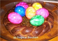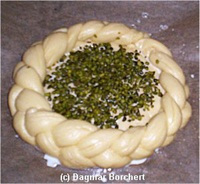 Teigboden und Teigrand mit Milch bepinseln, den Zopf um die Bodenplatte legen und ebenfalls mit Milch bepinseln. Das grün in der Mitte des Korbes kann durch essbares Ostergras (was ich persönlich nicht kenne) oder grünes Marzipan oder wie bei mir durch die Streuung von Pistazienkernen erfolgen.