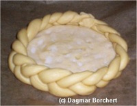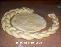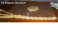 1/3 des Teiges wird zu einer ca. 20 cm runden Kreisfläche genutzt (zum Ausstechen habe ich eine runde Plastikschale genommen), während aus den anderen 2/3 Teig drei Stränge von je ca. 50 cm gerollt werden, die dann zu einem Zopf geflochten werden.